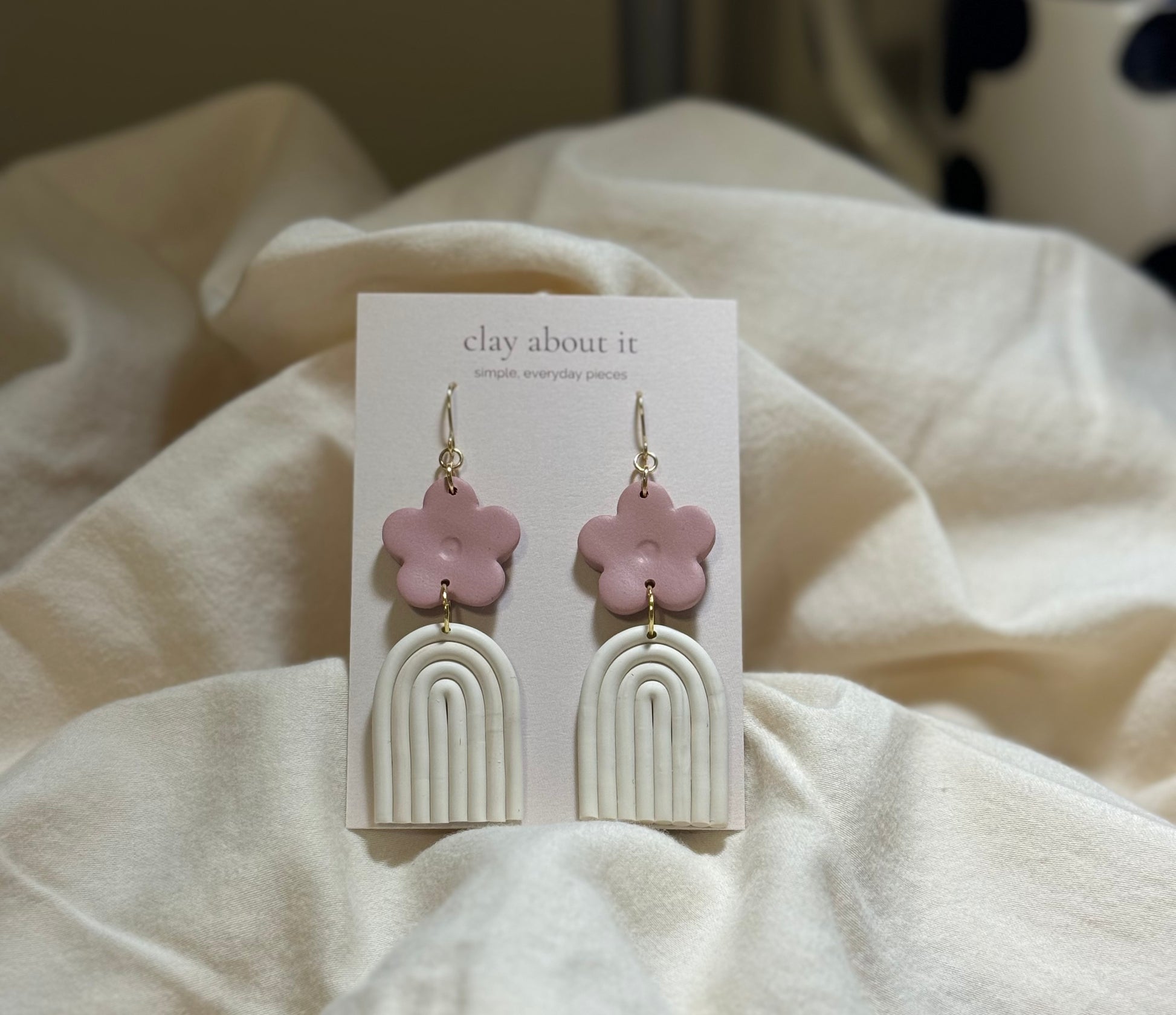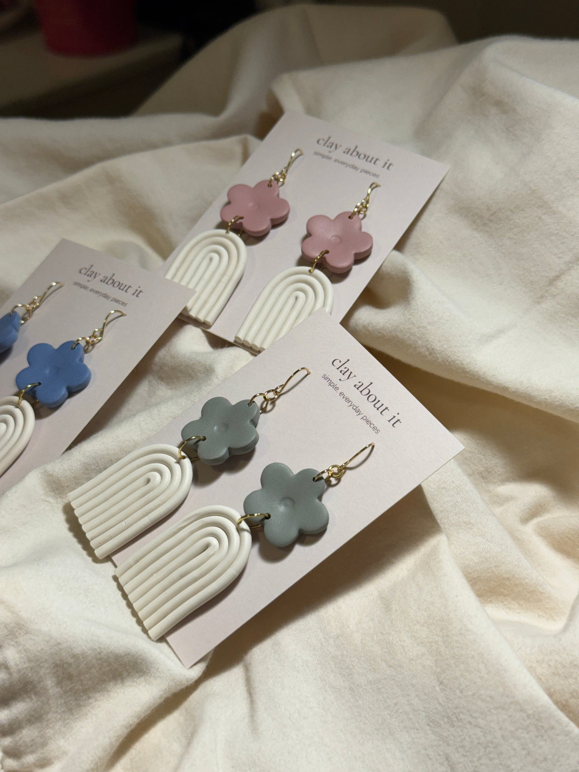 These playful, yet elegant flower dangles are sure to brighten up your day! Featuring gold plated stainless hooks posts and easy to style white arched bottom arches.